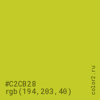 Цвет #C2CB28 в цветовой модели RGB обозначается тремя октетами (194, 203, 40) в десятичном формате и #C2CB28 в шестнадцатиричном (hex) формате, которые являются интенсивностью красного 194 (hex C2), интенсивность зелёного 203 (hex CB) и интенсивность синего 40 (hex 28).