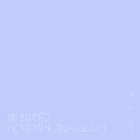 Цвет #C2CCFD в цветовой модели RGB обозначается тремя октетами (194, 204, 253) в десятичном формате и #C2CCFD в шестнадцатиричном (hex) формате, которые являются интенсивностью красного 194 (hex C2), интенсивность зелёного 204 (hex CC) и интенсивность синего 253 (hex FD).