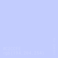 Цвет #C2CCFE в цветовой модели RGB обозначается тремя октетами (194, 204, 254) в десятичном формате и #C2CCFE в шестнадцатиричном (hex) формате, которые являются интенсивностью красного 194 (hex C2), интенсивность зелёного 204 (hex CC) и интенсивность синего 254 (hex FE).