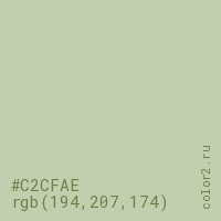 Цвет #C2CFAE в цветовой модели RGB обозначается тремя октетами (194, 207, 174) в десятичном формате и #C2CFAE в шестнадцатиричном (hex) формате, которые являются интенсивностью красного 194 (hex C2), интенсивность зелёного 207 (hex CF) и интенсивность синего 174 (hex AE).