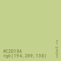 Цвет #C2D18A в цветовой модели RGB обозначается тремя октетами (194, 209, 138) в десятичном формате и #C2D18A в шестнадцатиричном (hex) формате, которые являются интенсивностью красного 194 (hex C2), интенсивность зелёного 209 (hex D1) и интенсивность синего 138 (hex 8A).