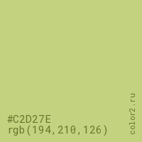 Цвет #C2D27E в цветовой модели RGB обозначается тремя октетами (194, 210, 126) в десятичном формате и #C2D27E в шестнадцатиричном (hex) формате, которые являются интенсивностью красного 194 (hex C2), интенсивность зелёного 210 (hex D2) и интенсивность синего 126 (hex 7E).