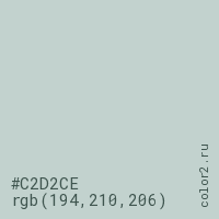 Цвет #C2D2CE в цветовой модели RGB обозначается тремя октетами (194, 210, 206) в десятичном формате и #C2D2CE в шестнадцатиричном (hex) формате, которые являются интенсивностью красного 194 (hex C2), интенсивность зелёного 210 (hex D2) и интенсивность синего 206 (hex CE).