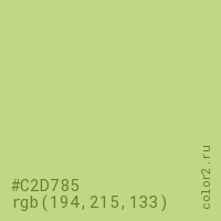 Цвет #C2D785 в цветовой модели RGB обозначается тремя октетами (194, 215, 133) в десятичном формате и #C2D785 в шестнадцатиричном (hex) формате, которые являются интенсивностью красного 194 (hex C2), интенсивность зелёного 215 (hex D7) и интенсивность синего 133 (hex 85).