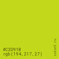 Цвет #C2D91B в цветовой модели RGB обозначается тремя октетами (194, 217, 27) в десятичном формате и #C2D91B в шестнадцатиричном (hex) формате, которые являются интенсивностью красного 194 (hex C2), интенсивность зелёного 217 (hex D9) и интенсивность синего 27 (hex 1B).