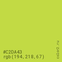 Цвет #C2DA43 в цветовой модели RGB обозначается тремя октетами (194, 218, 67) в десятичном формате и #C2DA43 в шестнадцатиричном (hex) формате, которые являются интенсивностью красного 194 (hex C2), интенсивность зелёного 218 (hex DA) и интенсивность синего 67 (hex 43).