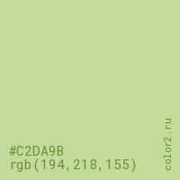 Цвет #C2DA9B в цветовой модели RGB обозначается тремя октетами (194, 218, 155) в десятичном формате и #C2DA9B в шестнадцатиричном (hex) формате, которые являются интенсивностью красного 194 (hex C2), интенсивность зелёного 218 (hex DA) и интенсивность синего 155 (hex 9B).