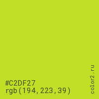 Цвет #C2DF27 в цветовой модели RGB обозначается тремя октетами (194, 223, 39) в десятичном формате и #C2DF27 в шестнадцатиричном (hex) формате, которые являются интенсивностью красного 194 (hex C2), интенсивность зелёного 223 (hex DF) и интенсивность синего 39 (hex 27).