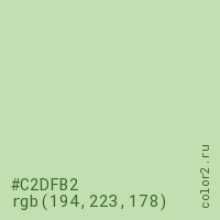 Цвет #C2DFB2 в цветовой модели RGB обозначается тремя октетами (194, 223, 178) в десятичном формате и #C2DFB2 в шестнадцатиричном (hex) формате, которые являются интенсивностью красного 194 (hex C2), интенсивность зелёного 223 (hex DF) и интенсивность синего 178 (hex B2).