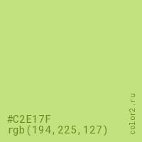 Цвет #C2E17F в цветовой модели RGB обозначается тремя октетами (194, 225, 127) в десятичном формате и #C2E17F в шестнадцатиричном (hex) формате, которые являются интенсивностью красного 194 (hex C2), интенсивность зелёного 225 (hex E1) и интенсивность синего 127 (hex 7F).