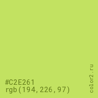 Цвет #C2E261 в цветовой модели RGB обозначается тремя октетами (194, 226, 97) в десятичном формате и #C2E261 в шестнадцатиричном (hex) формате, которые являются интенсивностью красного 194 (hex C2), интенсивность зелёного 226 (hex E2) и интенсивность синего 97 (hex 61).