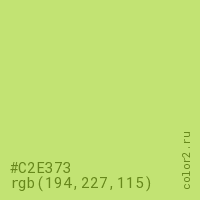 Цвет #C2E373 в цветовой модели RGB обозначается тремя октетами (194, 227, 115) в десятичном формате и #C2E373 в шестнадцатиричном (hex) формате, которые являются интенсивностью красного 194 (hex C2), интенсивность зелёного 227 (hex E3) и интенсивность синего 115 (hex 73).