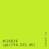 Цвет #C2EB28 в цветовой модели RGB обозначается тремя октетами (194, 235, 40) в десятичном формате и #C2EB28 в шестнадцатиричном (hex) формате, которые являются интенсивностью красного 194 (hex C2), интенсивность зелёного 235 (hex EB) и интенсивность синего 40 (hex 28).