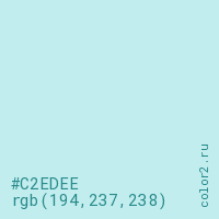 Цвет #C2EDEE в цветовой модели RGB обозначается тремя октетами (194, 237, 238) в десятичном формате и #C2EDEE в шестнадцатиричном (hex) формате, которые являются интенсивностью красного 194 (hex C2), интенсивность зелёного 237 (hex ED) и интенсивность синего 238 (hex EE).