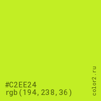 Цвет #C2EE24 в цветовой модели RGB обозначается тремя октетами (194, 238, 36) в десятичном формате и #C2EE24 в шестнадцатиричном (hex) формате, которые являются интенсивностью красного 194 (hex C2), интенсивность зелёного 238 (hex EE) и интенсивность синего 36 (hex 24).