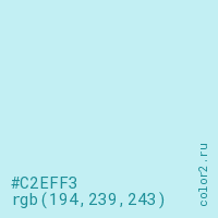 Цвет #C2EFF3 в цветовой модели RGB обозначается тремя октетами (194, 239, 243) в десятичном формате и #C2EFF3 в шестнадцатиричном (hex) формате, которые являются интенсивностью красного 194 (hex C2), интенсивность зелёного 239 (hex EF) и интенсивность синего 243 (hex F3).