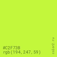Цвет #C2F73B в цветовой модели RGB обозначается тремя октетами (194, 247, 59) в десятичном формате и #C2F73B в шестнадцатиричном (hex) формате, которые являются интенсивностью красного 194 (hex C2), интенсивность зелёного 247 (hex F7) и интенсивность синего 59 (hex 3B).