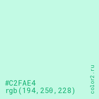 Цвет #C2FAE4 в цветовой модели RGB обозначается тремя октетами (194, 250, 228) в десятичном формате и #C2FAE4 в шестнадцатиричном (hex) формате, которые являются интенсивностью красного 194 (hex C2), интенсивность зелёного 250 (hex FA) и интенсивность синего 228 (hex E4).