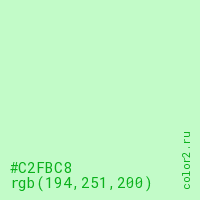 Цвет #C2FBC8 в цветовой модели RGB обозначается тремя октетами (194, 251, 200) в десятичном формате и #C2FBC8 в шестнадцатиричном (hex) формате, которые являются интенсивностью красного 194 (hex C2), интенсивность зелёного 251 (hex FB) и интенсивность синего 200 (hex C8).