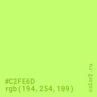 Цвет #C2FE6D в цветовой модели RGB обозначается тремя октетами (194, 254, 109) в десятичном формате и #C2FE6D в шестнадцатиричном (hex) формате, которые являются интенсивностью красного 194 (hex C2), интенсивность зелёного 254 (hex FE) и интенсивность синего 109 (hex 6D).