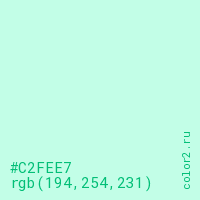 Цвет #C2FEE7 в цветовой модели RGB обозначается тремя октетами (194, 254, 231) в десятичном формате и #C2FEE7 в шестнадцатиричном (hex) формате, которые являются интенсивностью красного 194 (hex C2), интенсивность зелёного 254 (hex FE) и интенсивность синего 231 (hex E7).