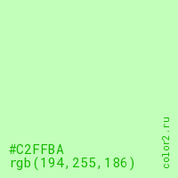 Цвет #C2FFBA в цветовой модели RGB обозначается тремя октетами (194, 255, 186) в десятичном формате и #C2FFBA в шестнадцатиричном (hex) формате, которые являются интенсивностью красного 194 (hex C2), интенсивность зелёного 255 (hex FF) и интенсивность синего 186 (hex BA).