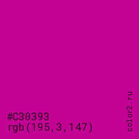 Цвет #C30393 в цветовой модели RGB обозначается тремя октетами (195, 3, 147) в десятичном формате и #C30393 в шестнадцатиричном (hex) формате, которые являются интенсивностью красного 195 (hex C3), интенсивность зелёного 3 (hex 03) и интенсивность синего 147 (hex 93).