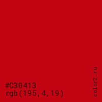 Цвет #C30413 в цветовой модели RGB обозначается тремя октетами (195, 4, 19) в десятичном формате и #C30413 в шестнадцатиричном (hex) формате, которые являются интенсивностью красного 195 (hex C3), интенсивность зелёного 4 (hex 04) и интенсивность синего 19 (hex 13).