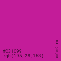 Цвет #C31C99 в цветовой модели RGB обозначается тремя октетами (195, 28, 153) в десятичном формате и #C31C99 в шестнадцатиричном (hex) формате, которые являются интенсивностью красного 195 (hex C3), интенсивность зелёного 28 (hex 1C) и интенсивность синего 153 (hex 99).