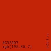 Цвет #C32307 в цветовой модели RGB обозначается тремя октетами (195, 35, 7) в десятичном формате и #C32307 в шестнадцатиричном (hex) формате, которые являются интенсивностью красного 195 (hex C3), интенсивность зелёного 35 (hex 23) и интенсивность синего 7 (hex 07).