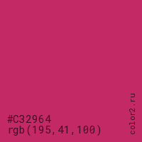 Цвет #C32964 в цветовой модели RGB обозначается тремя октетами (195, 41, 100) в десятичном формате и #C32964 в шестнадцатиричном (hex) формате, которые являются интенсивностью красного 195 (hex C3), интенсивность зелёного 41 (hex 29) и интенсивность синего 100 (hex 64).