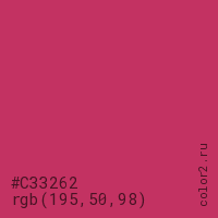 Цвет #C33262 в цветовой модели RGB обозначается тремя октетами (195, 50, 98) в десятичном формате и #C33262 в шестнадцатиричном (hex) формате, которые являются интенсивностью красного 195 (hex C3), интенсивность зелёного 50 (hex 32) и интенсивность синего 98 (hex 62).