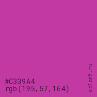 Цвет #C339A4 в цветовой модели RGB обозначается тремя октетами (195, 57, 164) в десятичном формате и #C339A4 в шестнадцатиричном (hex) формате, которые являются интенсивностью красного 195 (hex C3), интенсивность зелёного 57 (hex 39) и интенсивность синего 164 (hex A4).