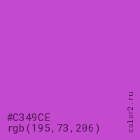 Цвет #C349CE в цветовой модели RGB обозначается тремя октетами (195, 73, 206) в десятичном формате и #C349CE в шестнадцатиричном (hex) формате, которые являются интенсивностью красного 195 (hex C3), интенсивность зелёного 73 (hex 49) и интенсивность синего 206 (hex CE).