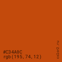 Цвет #C34A0C в цветовой модели RGB обозначается тремя октетами (195, 74, 12) в десятичном формате и #C34A0C в шестнадцатиричном (hex) формате, которые являются интенсивностью красного 195 (hex C3), интенсивность зелёного 74 (hex 4A) и интенсивность синего 12 (hex 0C).