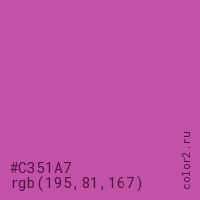 Цвет #C351A7 в цветовой модели RGB обозначается тремя октетами (195, 81, 167) в десятичном формате и #C351A7 в шестнадцатиричном (hex) формате, которые являются интенсивностью красного 195 (hex C3), интенсивность зелёного 81 (hex 51) и интенсивность синего 167 (hex A7).