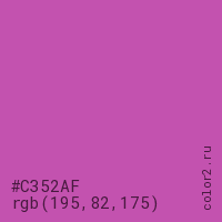 Цвет #C352AF в цветовой модели RGB обозначается тремя октетами (195, 82, 175) в десятичном формате и #C352AF в шестнадцатиричном (hex) формате, которые являются интенсивностью красного 195 (hex C3), интенсивность зелёного 82 (hex 52) и интенсивность синего 175 (hex AF).