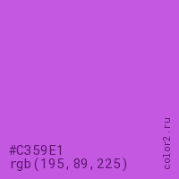 Цвет #C359E1 в цветовой модели RGB обозначается тремя октетами (195, 89, 225) в десятичном формате и #C359E1 в шестнадцатиричном (hex) формате, которые являются интенсивностью красного 195 (hex C3), интенсивность зелёного 89 (hex 59) и интенсивность синего 225 (hex E1).
