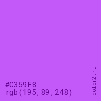 Цвет #C359F8 в цветовой модели RGB обозначается тремя октетами (195, 89, 248) в десятичном формате и #C359F8 в шестнадцатиричном (hex) формате, которые являются интенсивностью красного 195 (hex C3), интенсивность зелёного 89 (hex 59) и интенсивность синего 248 (hex F8).