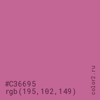 Цвет #C36695 в цветовой модели RGB обозначается тремя октетами (195, 102, 149) в десятичном формате и #C36695 в шестнадцатиричном (hex) формате, которые являются интенсивностью красного 195 (hex C3), интенсивность зелёного 102 (hex 66) и интенсивность синего 149 (hex 95).