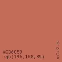 Цвет #C36C59 в цветовой модели RGB обозначается тремя октетами (195, 108, 89) в десятичном формате и #C36C59 в шестнадцатиричном (hex) формате, которые являются интенсивностью красного 195 (hex C3), интенсивность зелёного 108 (hex 6C) и интенсивность синего 89 (hex 59).