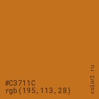 Цвет #C3711C в цветовой модели RGB обозначается тремя октетами (195, 113, 28) в десятичном формате и #C3711C в шестнадцатиричном (hex) формате, которые являются интенсивностью красного 195 (hex C3), интенсивность зелёного 113 (hex 71) и интенсивность синего 28 (hex 1C).