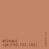 Цвет #C38466 в цветовой модели RGB обозначается тремя октетами (195, 132, 102) в десятичном формате и #C38466 в шестнадцатиричном (hex) формате, которые являются интенсивностью красного 195 (hex C3), интенсивность зелёного 132 (hex 84) и интенсивность синего 102 (hex 66).