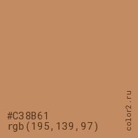 Цвет #C38B61 в цветовой модели RGB обозначается тремя октетами (195, 139, 97) в десятичном формате и #C38B61 в шестнадцатиричном (hex) формате, которые являются интенсивностью красного 195 (hex C3), интенсивность зелёного 139 (hex 8B) и интенсивность синего 97 (hex 61).