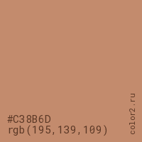 Цвет #C38B6D в цветовой модели RGB обозначается тремя октетами (195, 139, 109) в десятичном формате и #C38B6D в шестнадцатиричном (hex) формате, которые являются интенсивностью красного 195 (hex C3), интенсивность зелёного 139 (hex 8B) и интенсивность синего 109 (hex 6D).