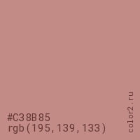 Цвет #C38B85 в цветовой модели RGB обозначается тремя октетами (195, 139, 133) в десятичном формате и #C38B85 в шестнадцатиричном (hex) формате, которые являются интенсивностью красного 195 (hex C3), интенсивность зелёного 139 (hex 8B) и интенсивность синего 133 (hex 85).
