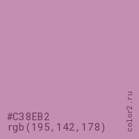 Цвет #C38EB2 в цветовой модели RGB обозначается тремя октетами (195, 142, 178) в десятичном формате и #C38EB2 в шестнадцатиричном (hex) формате, которые являются интенсивностью красного 195 (hex C3), интенсивность зелёного 142 (hex 8E) и интенсивность синего 178 (hex B2).
