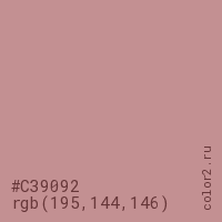 Цвет #C39092 в цветовой модели RGB обозначается тремя октетами (195, 144, 146) в десятичном формате и #C39092 в шестнадцатиричном (hex) формате, которые являются интенсивностью красного 195 (hex C3), интенсивность зелёного 144 (hex 90) и интенсивность синего 146 (hex 92).