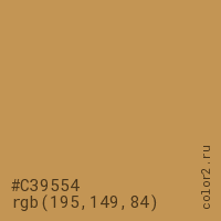 Цвет #C39554 в цветовой модели RGB обозначается тремя октетами (195, 149, 84) в десятичном формате и #C39554 в шестнадцатиричном (hex) формате, которые являются интенсивностью красного 195 (hex C3), интенсивность зелёного 149 (hex 95) и интенсивность синего 84 (hex 54).