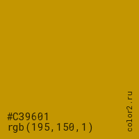 Цвет #C39601 в цветовой модели RGB обозначается тремя октетами (195, 150, 1) в десятичном формате и #C39601 в шестнадцатиричном (hex) формате, которые являются интенсивностью красного 195 (hex C3), интенсивность зелёного 150 (hex 96) и интенсивность синего 1 (hex 01).